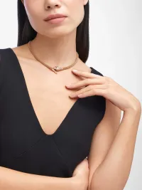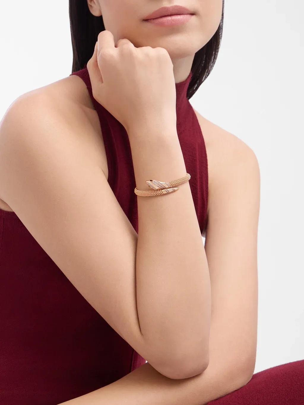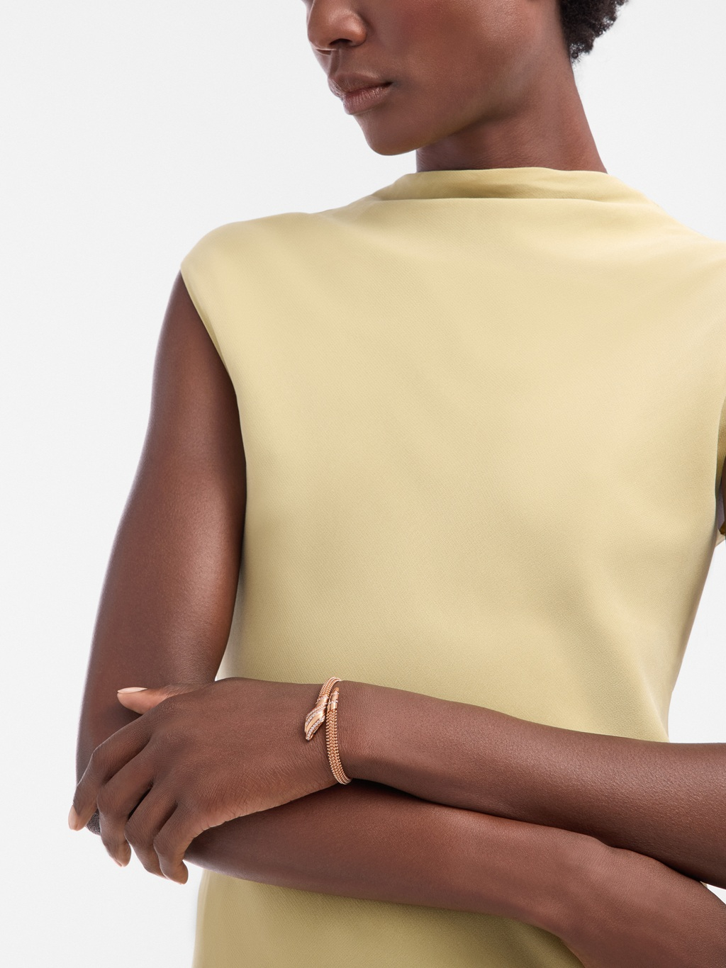 Nová kolekce z růžového zlata staví do popředí typické flexibilní korálky, které podtrhují plynulost linií i smyslnou přitažlivost každého jednoho designu. Náhrdelník se ladně obtáčí kolem krku. Hlava a ocas hada se s působivou elegancí setkávají v přední části, zatímco jednoduchý náramek smyslně lemuje zápěstí.