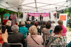 Kousek Francie přinese na zahradu Galerie Villa Pellé hudební uskupení VOILA se svým šansonem, následované energií lidové hudby folklorního souboru Muzička. Na pódiu se představí také pěvecký sbor zaměstnanců partnerské Ústřední vojenské nemocnice Praha. Odpoledne v zahradě nabídne rovněž módní přehlídku modelů Ivany Follové. Závěr festivalu bude patřit vystoupení Petry Černocké.