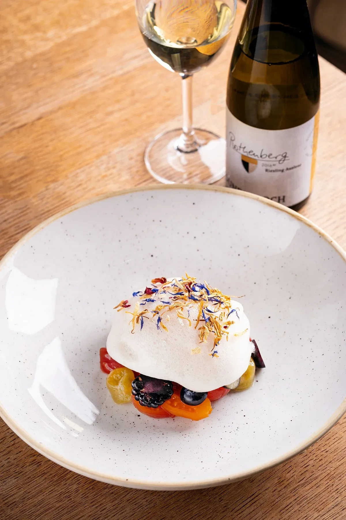 Večer jsem zakončil lahodným dezertem, kterým byla marinovaná rajčata Datterino, lesní ovoce a bazalkový sorbet. Toto byl originální a osvěžující dezert, který mi překvapil svou kombinací chutí. Rajčata Datterino byla sladká a šťavnatá, lesní ovoce bylo čerstvé a vonné. Bazalkový sorbet byl mrazivý a aromatický. Vše dohromady tvořilo harmonický celek.