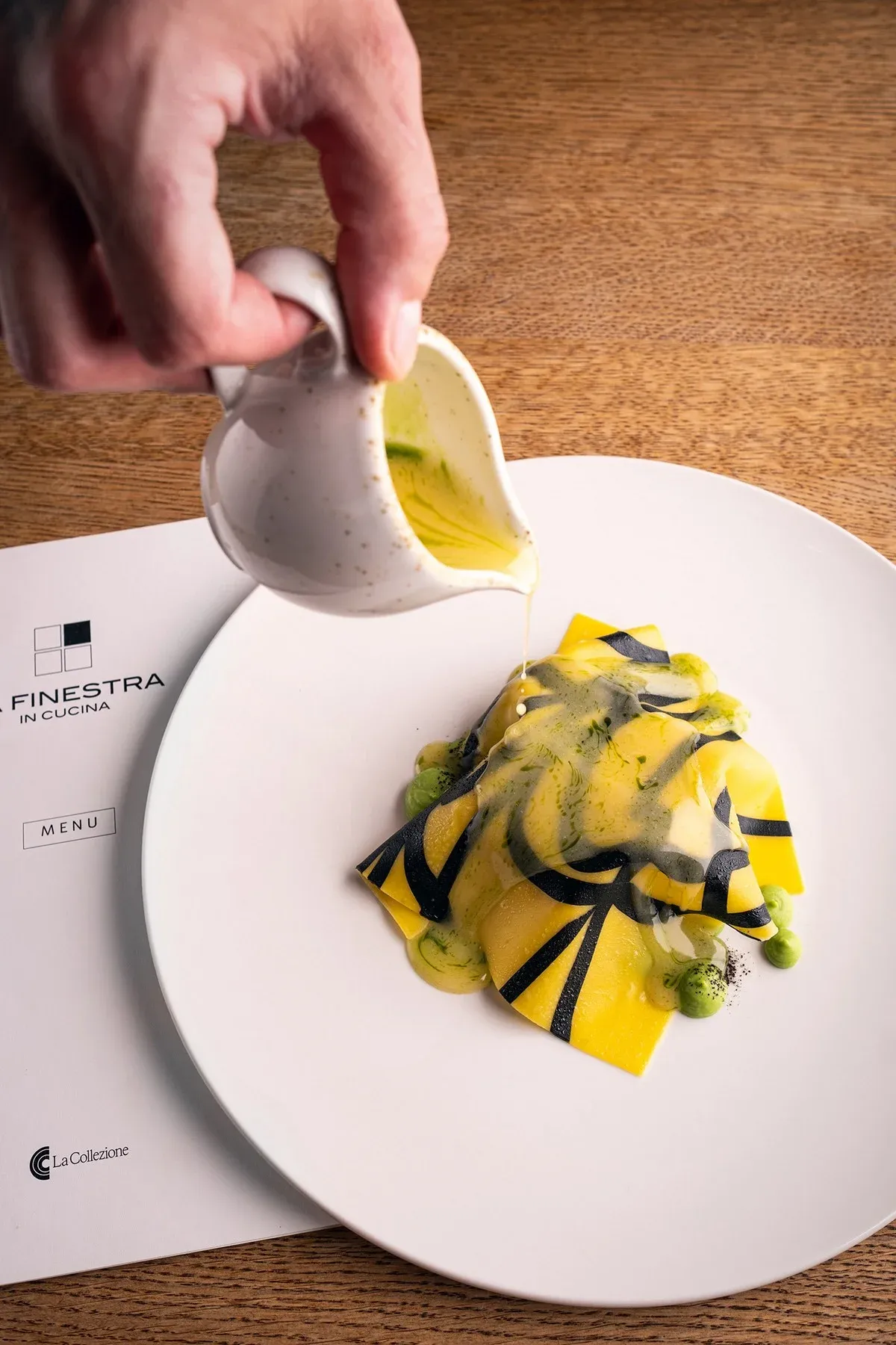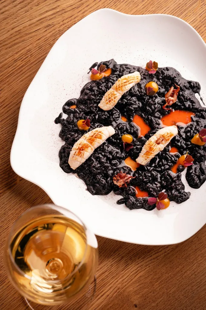 Risotto al Nero, grilované kalamáry, pyré z pomeranče je další vynikající hlavní chod, který jsem si objednal v restauraci La Finestra in Cucina. Toto jídlo je inspirováno italskou kuchyní a kombinuje rýži, mořské plody a ovoce v harmonickém celku. Risotto al Nero je rizoto s černým barvivem z chobotnice, které mu dodává zajímavou barvu a chuť. Rizoto bylo krémové a al dente, s jemnou slaností a mořskou vůní. Grilované kalamáry byly čerstvé a šťavnaté, s lehkou karamelizací na povrchu. Pyré z pomeranče bylo sladké a osvěžující, s jemnou kyselostí a ovocnou vůní. Vše bylo doplněno petrželkou a olivovým olejem.