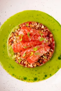 Začal jsem předkrmem, kterým bylo crudo z krevet Gambero Rosso, panzanella, okurkové gazpacho. Toto byla lehká a osvěžující kombinace, která mi připomněla léto. Krevety byly čerstvé a šťavnaté, panzanella byla chrumkavá a aromatická, okurkové gazpacho bylo krémové a osvěžující. Vše bylo doplněno olivovým olejem a citronovou šťávou.