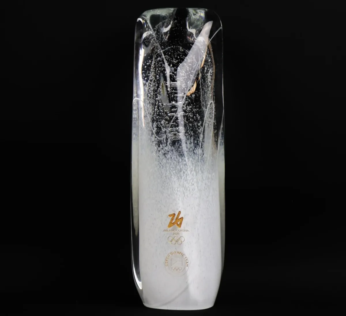 Vizuální charakter trofeje podtrhuje práce se světlem. Jemné bubliny ve skle a postupná změna transparentnosti vytvářejí dojem mrazivé struktury sněhu a ledu. Povrch doplňují pískované linie inspirované olympijskými piktogramy a bodovacími stopami na sněhu a ledu, které dávají objektu rytmus a hloubku.