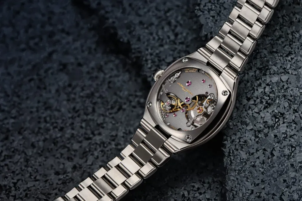 Uvnitř tohoto technického šperku bije exkluzivní automatický strojek s mikrorotorem, který je viditelný skrze safírové dýnko. Tato mechanika není jen funkčním prvkem, ale uměleckým dílem samo o sobě, každý komponent je ručně dokončen, zkosen a leštěn podle nejpřísnějších standardů vysokého hodinářství. Integrovaný titanový tah plynule navazuje na pouzdro a vytváří tak kompaktní celek, který působí velmi organicky a přirozeně.