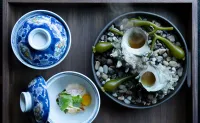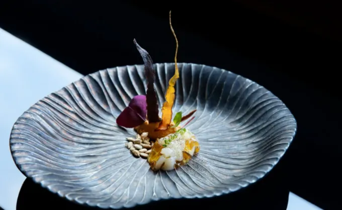 Degustační zážitek začíná jemnými předkrmy, jako je sakizuke – malý chod, který otevírá paletu chutí s lehkostí a elegancí. Nedávno se v menu objevil sakizuke s hokkaidským hřebenatkem a želé z chřestu, který je doplněn jedlými slunečnicemi. Tento pokrm je nejen vizuálně nádherný, ale také dokonale sladěný, kdy se svěžest mořských plodů mísí s jarními tóny chřestu.