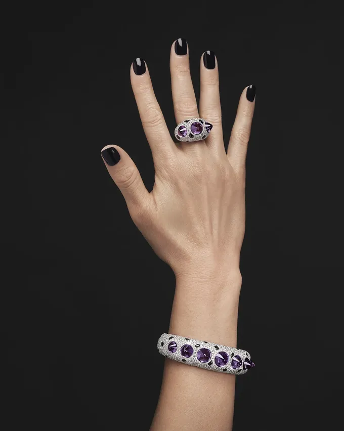 Shagreen zasazení je tvořené složitým a pečlivým výběrem kamenů různých velikostí, které drží pohromadě bez nutnosti použití krapen. Výběr kamenů se soustředí na ametystové cvočky, ručně broušené přírodní drahokamy, jejichž velikost je upravena šperkaři Cartier a vytváří hru proporcí, které se postupně na pozadí diamantového pavé mění.