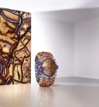 Drahokamy konverzují bok po boku v dialogu těkajícím mezi neprůsvitností a průhledností, mezi minerály a drahými kameny, mezi čistými barvami a pableskujícími nuancemi, mezi zemí a světlem.