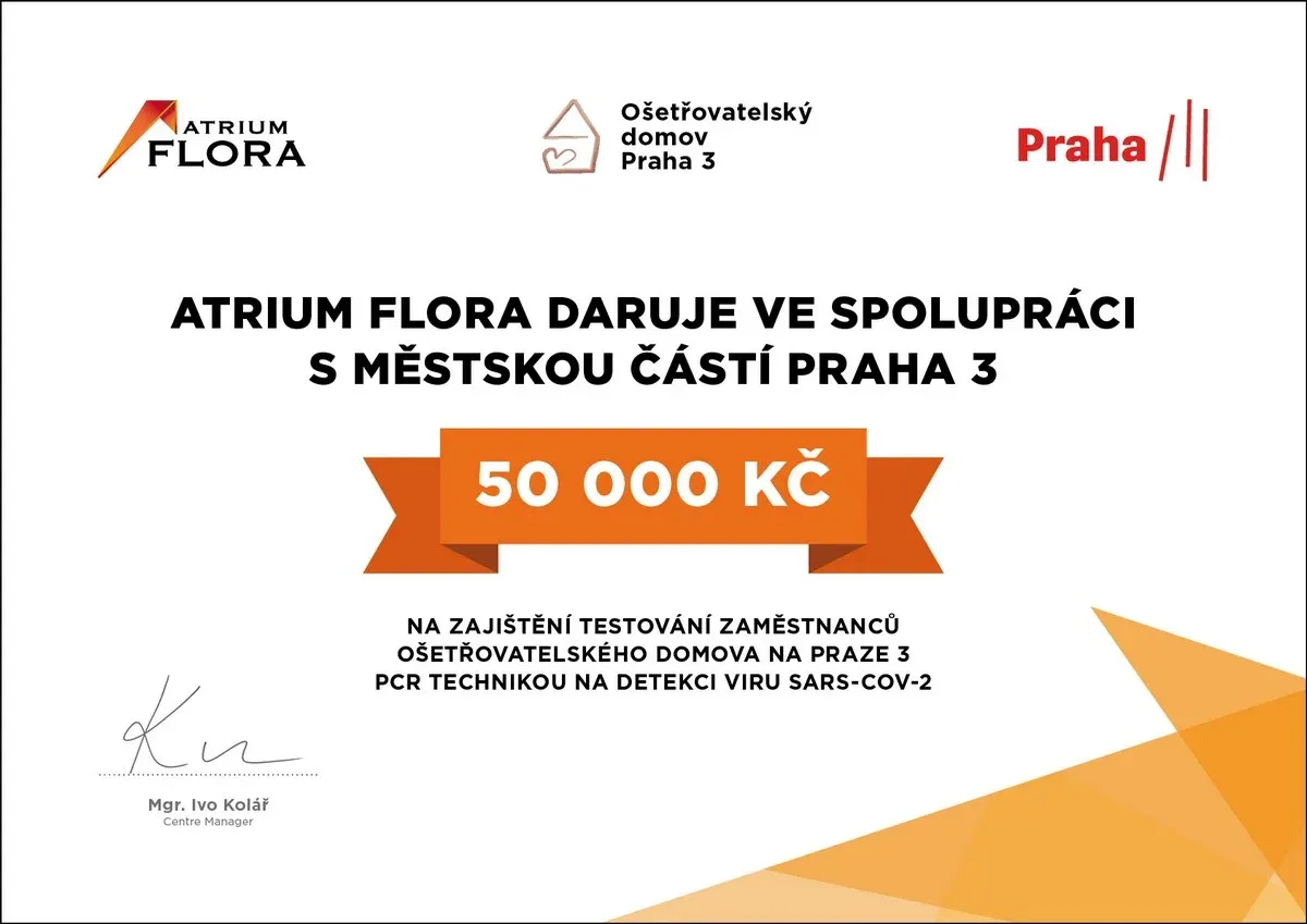 Obchodní centrum proto oficiálně navázalo spolupráci s Ošetřovatelským domovem Prahy 3, kterému daruje 50 000 Kč na zajištění testování. Pomoc bude realizována ve spolupráci s Prahou 3, která je zřizovatelem tohoto domova. Ošetřovatelský domov Prahy 3 poskytuje své služby seniorům a zdraví jeho zaměstnanců je velmi důležité pro zdraví pacientů domova. Obchodní centrum Atrium Flora si také velmi váží práce všech zdravotníků blízké Fakultní nemocnice Královské Vinohrady, kam daruje kvalitní kávovar. Ten půjde přímo na oddělení věnující se péči o nakažené pacienty.