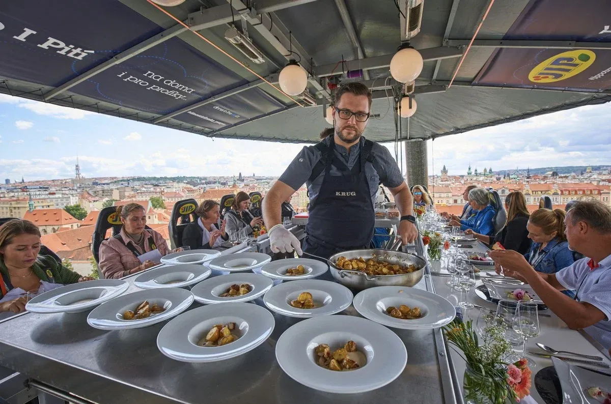 Příjemně sedíte kolem stolu, v jehož středu připravuje šéfkuchař na 2 m 2 vaše pokrmy. Užít si můžete tříchodový oběd, čtyřchodovou večeři při západu slunce či pozdní večeři pod hvězdami. Letos se na plošinu ve výšce 40 metrů podívá šéfkuchař Peter Slačka, zářivá hvězda slovenské gastronomie. Zkušenosti sbíral ve fine diningových restauracích v Austrálii, Portugalsku, Švédsku a Velké Británii, aby se vrátil do rodné Bratislavy a obohatil tamní gastroscénu moderní slovenskou kuchyní s fusion světovými prvky. Kuchařem se přitom stal náhodou – při studiu chodil na brigádu do stánku s gyrosem a uvědomil si, jak moc ho těší, když lidem chutná. Pak nastoupil do vyhlášené bratislavské restaurace Karibik a do nově otevřeného hotelu Kempinski.