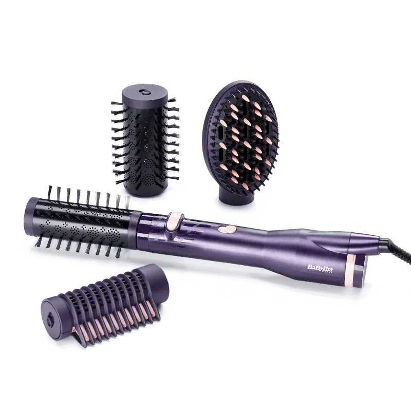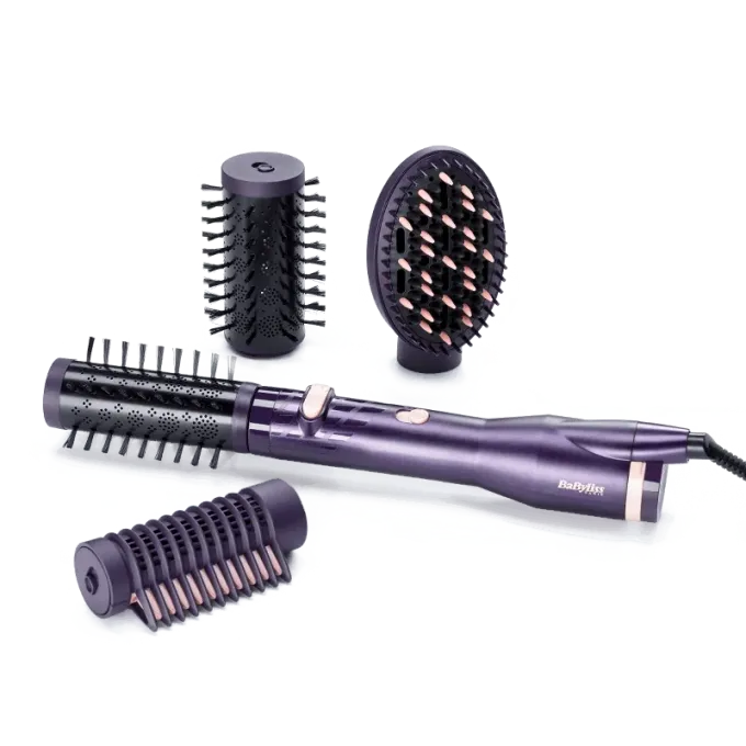 Horkovzdušný kartáč je proveden v elegantním fialovém ladění. Má ergonomický design a úzkou rukojeť pro snadnou manipulaci. Otočný kabel o 360° zamezuje kroucení a zadní filtr kartáče je pro snadné čištění vyjímatelný. Praktické využití najde i přiložený cestovní a skladovací obal.