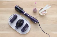 Výbava obsahuje 4 výměnné nástavce s keramickou povrchovou úpravou pro různé typy účesu. Rotační hlavice Deep Black s kančími štětinami o průměru 50 mm je určena na kartáčování. Pro finální úpravy a dokončení účesu se hodí otočný hřeben o průměru 40 mm se štětinami z jemného nylonu. Nástavec pro žehlení Deep Black Ceramic je vhodný pro hladký účes a je opatřen nastavovacím kolečkem pro volbu buď rychlého vyhlazení, nebo vyhlazení s objemem od kořínků. A pokud toužíte po účesu s přirozeným tvarem, pak vyberte kartáč pro jemné rozčesání vlasů a styling.