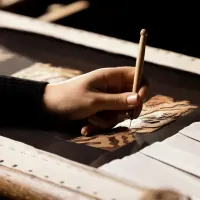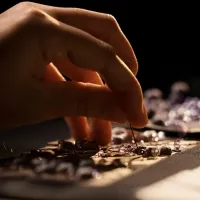 Součástí rakve je ručně vyšívaná podšívka, která znázorňuje les protnutý paprsky světla, odrážející čichovou atmosféru vůně. Na plátně jsou na intarzii dřevěné hobliny a samary, které evokují strom. Ametystové bikónové korálky a štětcem obarvené ozdobné ozdoby symbolizují zrnka růžového pepře a bobule jalovce, zatímco nitě a polnice připomínají prameny světlého tabáku.