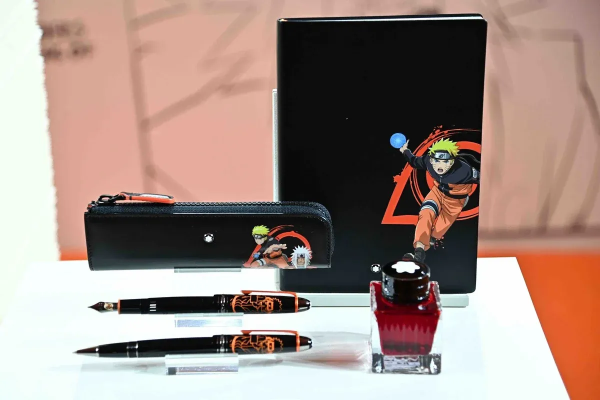 Součástí kolekce je nová edice ikonického pera značky Montblanc Meisterstück, psacího nástroje, který již po generace slouží k sebevyjádření a kreativitě. Speciální edice Meisterstück Montblanc x Naruto je k dispozici jako rollerball, ballpoint nebo plnicí pero se zlatým hrotem pokoveným rutheniem a ozdobeným symbolem Listové vesnice ze žlutého zlata. Psací sortiment doplňuje speciální oranžový inkoust ve skleněné lahvičce a kožený zápisník s motivem Naruta.