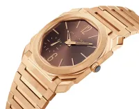 Čistý a jednoduchý design je poznávacím znakem kolekce Octo Finissimo. Odráží se i v nové, zlaté verzi modelu Octo Finissimo Automatic. Hra kontrastů mezi růžovým či žlutým zlatem a hnědým lakovaným číselníkem propůjčuje tomuto modelu působivé kouzlo osobnosti. Dalším kontrastem, jenž se v této kolekci objevuje vůbec poprvé, je střídání matného a lesklého efektu na pouzdře a náramku. Linie Finissimo tak začíná psát zbrusu novou kapitolu…