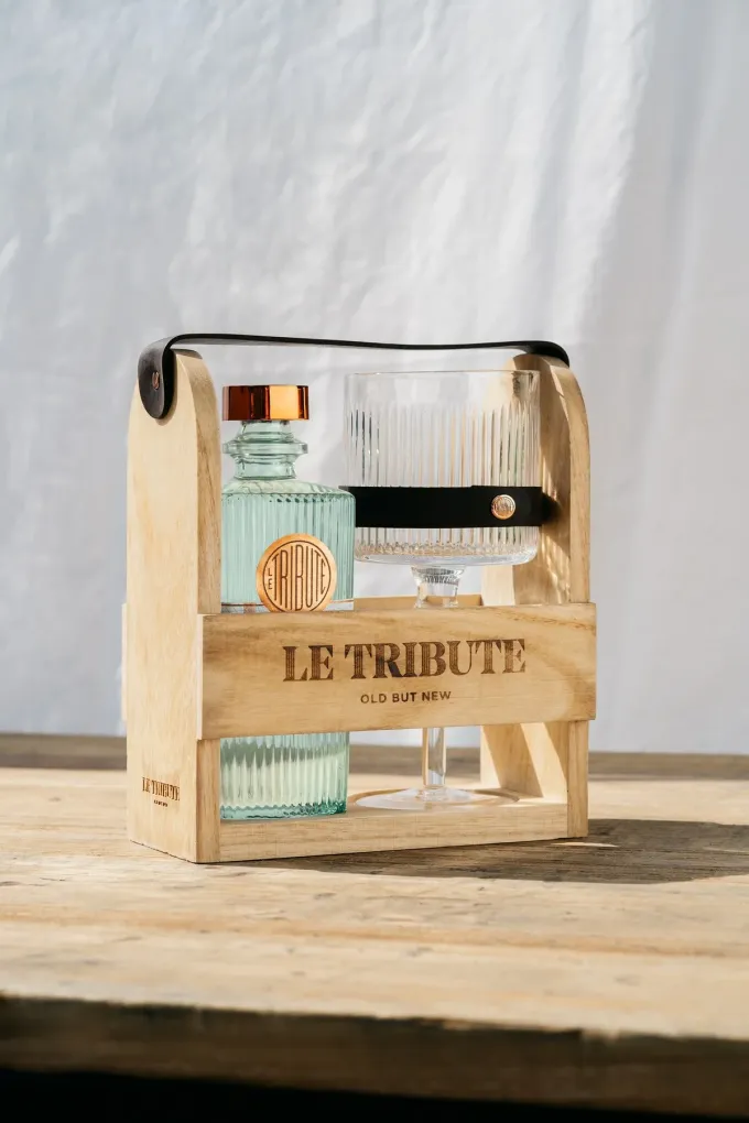 Le Tribute Gin v dřevěném dárkovém balení se skleničkou
