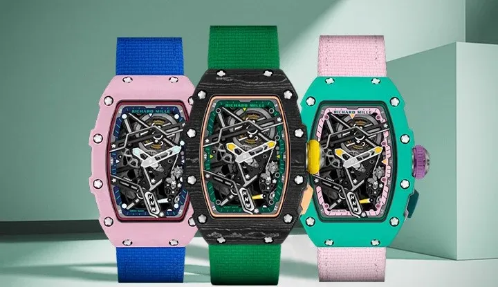 Protože je každý vyroben z několika vrstev paralelních uhlíkových vláken nebo vláken oxidu křemičitého, každý vypadá trochu jinak než ostatní, i když je dokončen stejnou barvou. Richard Mille dokončuje titanovou korunku každých hodinek saténovým povrchem, který je poté mikrotryskán a leštěn.