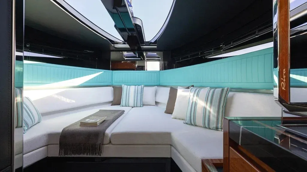 Vstup do hlavního salonu je zážitkem sám o sobě. Díky oknům sahajícím od podlahy až ke stropu se hranice mezi interiérem a nekonečným horizontem téměř stírá. Designéři vsadili na kombinaci ušlechtilých materiálů, leštěného dřeva, prémiové kůže a nerezové oceli, což jsou prvky, které k DNA značky Riva neodmyslitelně patří. Hlavní paluba hostí velkorysé Owner’s Suite v přední části, které majiteli poskytuje maximální soukromí a nerušený výhled na příď. Podpalubí pak nabízí další čtyři luxusní kajuty pro hosty, z nichž každá disponuje vlastní koupelnou, což z Cento dělá ideální loď pro rodinné plavby i reprezentativní hostiny.