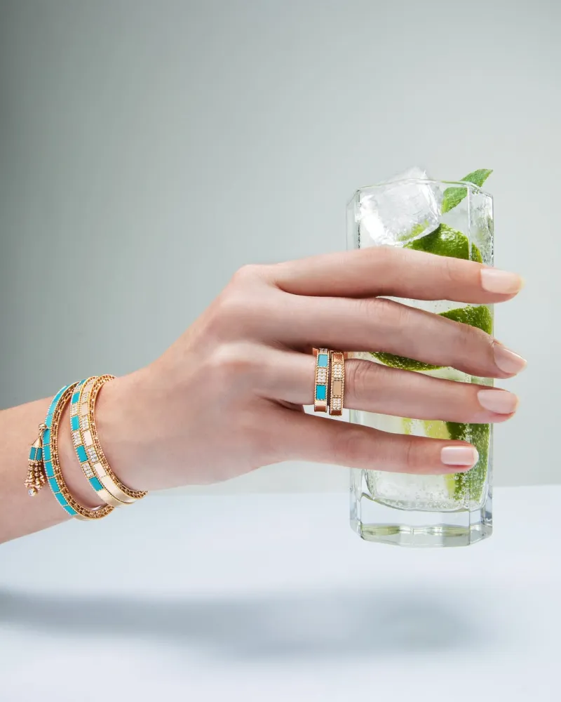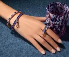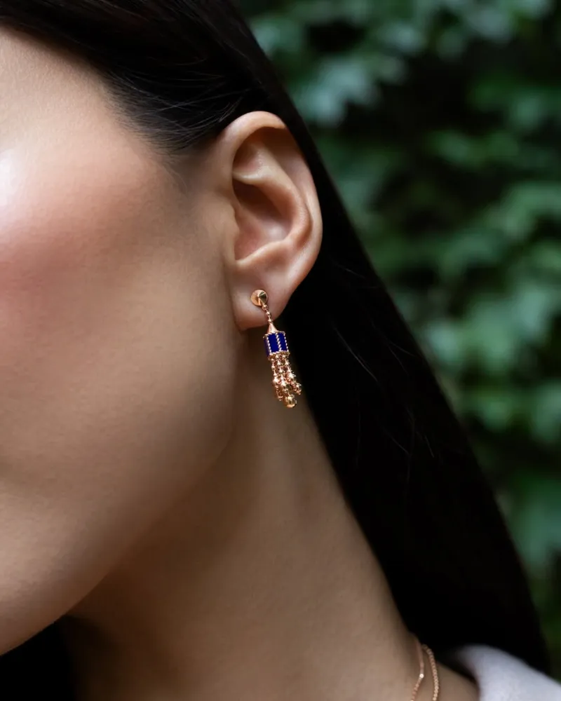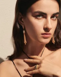 Kolekce Art Deco vyniká výraznou hrou geometrie a různorodých barev drahých kamenů, které posouvají klasickou eleganci až na hranici odvážné provokace. Čisté linie a precizní tvary zde kontrastují s jemným pohybem střapců, zatímco 18kt růžové a žluté zlato se prolíná s tajemným černým nefritem, uhrančivým malachitem, sofistikovanou perletí či zářivým tyrkysem.