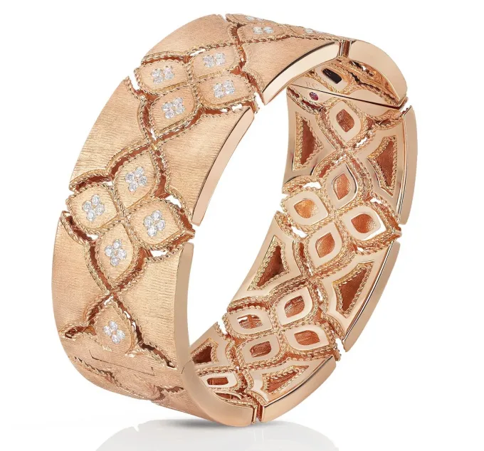 Roberto Coin sáhl po svém ikonickém motivu kroucené nitě. Zářivá vazba zahaluje šperky do tajemství, jež připomíná starobylé paláce Benátek. Růžové zlato evokuje slunce odrážející se na blyštivých kupolích. Bílé diamanty se ve špercích třpytí jako odhodlání v očích žen, které jsou jimi ozdobeny. Ať už si vyberete ornamentální náramek nebo jemné náušnice, dáte najevo, že ze svých snů umíte stvořit realitu. Proměňte život okolo sebe svým kouzlem k lepšímu a staňte se heroickou princeznou těchto dnů.