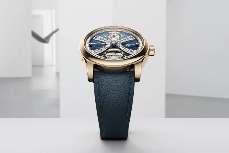 Zatímco základní mechanika věčného kalendáře a biretrográdního zobrazení přímo navazuje na Dubuisovu práci z roku 1995, celková konstrukce a barevná paleta číselníku působí naprosto moderně. A co je nejdůležitější, tato kreace nese moderní certifikaci Poinçon de Genève (Ženevská pečeť), což je závazek kvality, který Roger Dubuis od počátku své nezávislosti ctil. Design s pouzdrem o průměru 38 mm připomíná elegantní proporce před rokem 2000, ale celkové zpracování vyzařuje vytříbenost, jakou dnešní Haute Horlogerie vyžaduje.