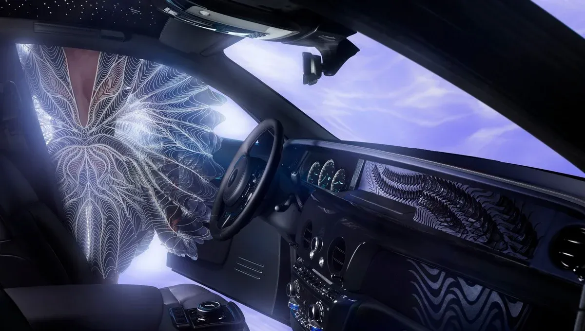 Po otevření velkolepých protisměrných dveří okamžitě upoutá pozornost hvězdná obloha Starlight Headliner s motivem „tkané vody“. Jedná se o technicky nejnáročnější verzi tohoto charakteristického prvku vozů Rolls-Royce, jaký byl kdy vyroben. Vznikl z jednoho kusu vysoce jakostní kůže vybrané z více než 1 000 vzorků. Přesné symetrické střihy na spodní straně odhalují stříbrnou texturu „tekutého kovu“, vyrobenou z nylonové tkaniny, která se používá v kolekci „Embossed Sounds“ Iris van Herpenové a dodává stropnímu obložení trojrozměrný styl. Povrch je dotvořen 162 jemnými okvětními lístky vyrobenými z jiskřivé organzy, kterou během téměř 300 hodin instalovali spolupracovníci Iris van Herpenové přímo v Goodwoodu. Kromě toho bylo podél uměleckého díla ručně nainstalováno 187 z 995 zářících „hvězd“ z optických vláken. Rozsvěcují se postupně zezadu směrem vpřed, což vytváří pocit pohybu. Jen samotné stropní obložení zabralo celkem téměř 700 hodin práce celého kolektivu. Téma „tkané vody“ pokračuje na jedinečném uměleckém provedení obkladu palubní desky Gallery a pokrývá ji po celé její šířce. Toto vysoce expresivní dílo, které kombinuje tradiční techniky haute couture a inovativní vizuální formy, zahrnuje dalších 85 okvětních lístků, které byly během téměř 60 hodin pečlivé práce ručně vsazeny týmem Iris van Herpenové při jeho působení v Goodwoodu.