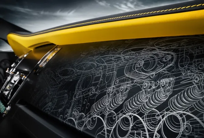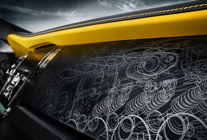 Na počest tohoto vůbec posledního kupé s motorem V12 od automobilky Rolls-Royce spolupracoval tým pracovníků jejího programu Bespoke složený z designérů, uměleckých řemeslníků a inženýrů na vytvoření jedinečného uměleckého díla pro palubní desku modelu Wraith Black Badge Black Arrow. Působivý hmatový dojem dovedně odráží současný motor V12 v modelu Wraith. V souladu s „noir“ atmosférou rodiny modelů Black Badge je tento velmi propracovaný vzor vyrytý do jediného plátu černě potaženého hliníku, který odhaluje lesknoucí se kov pod ním a poskytuje odvážné vizuální spojení s hliníkovou karoserií rekordního vozu Thunderbolt.
