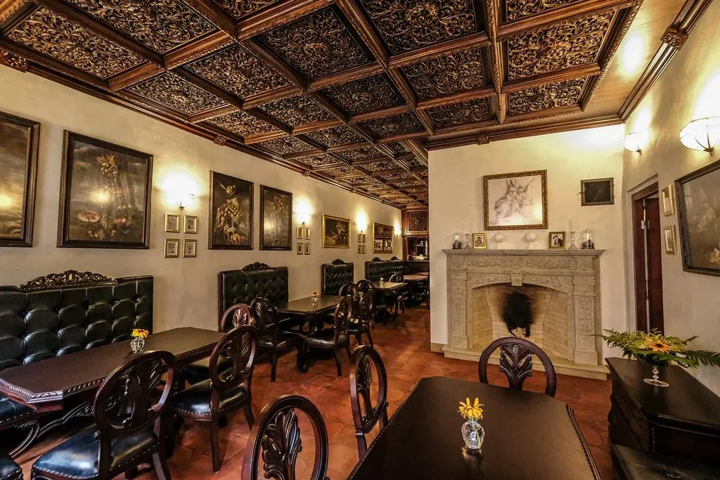 Po levé straně v přízemí se nachází hotelová restaurace, která na první pohled zaujme svým vybavením. Připomíná galerii manýrismu pozdní renesance, kde vzápětí narazíte i na ilustrace bylin a rostlin ze starých herbářů od 15.-19. století, ale i na legendární příšery, které byly hojně zachycovány umělci v nejrůznějších tajných almanaších. Nabídka jídel se nese v duchu české a rakouské kuchyně s modernější úpravou a stylovou prezentací. V restauraci máme nádherný funkční krb z pískovce a ve snídaňovém salonku druhý, tentokrát ze zeleného mramoru, v němž je vytesána domnělá podobizna Antonína Michaela z Ebersbachu.