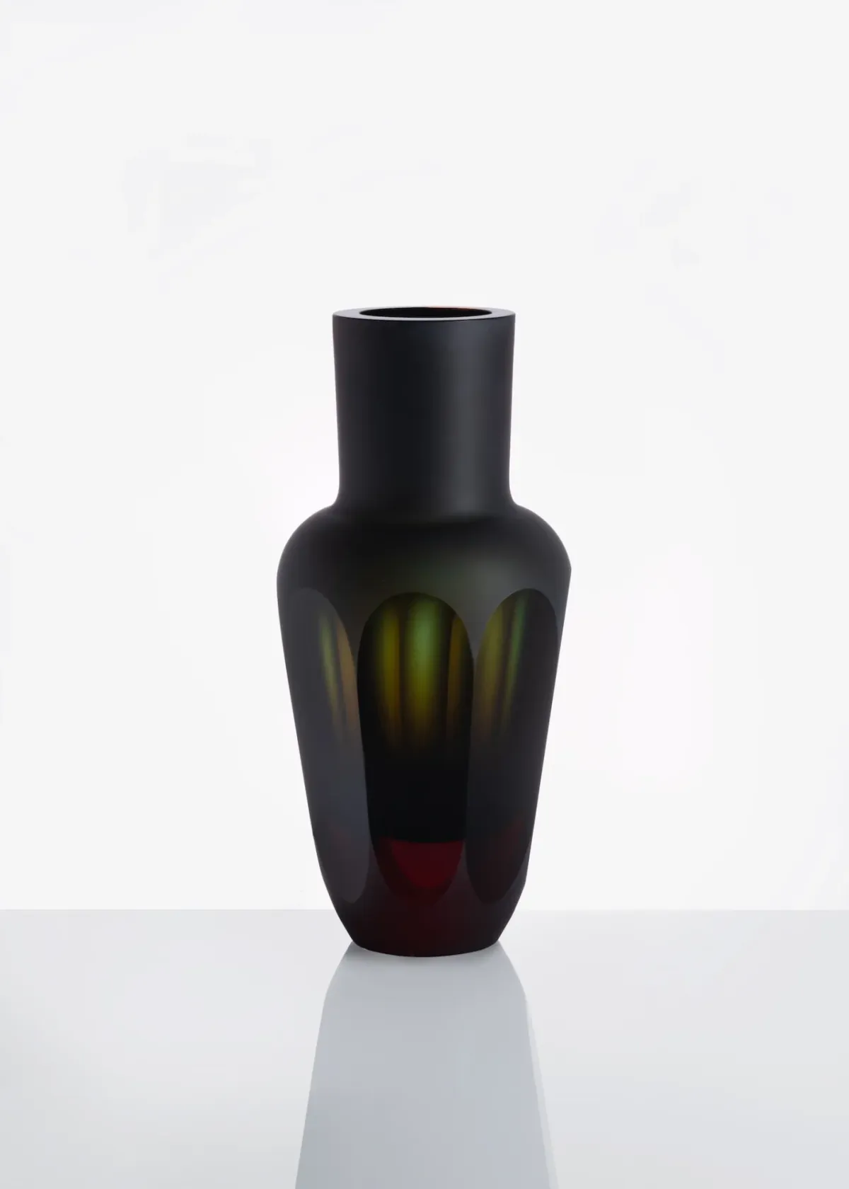 V případě temně zelené vázy s rudými odlesky se propojuje matný a čirý povrch, který dá vyniknout jednotlivým ručně zhotoveným hranám. „Mistrovství Jiřího Štencla je patrné zejména u tohoto typu vázy, jelikož málokterý brusič by si dokázal poradit s kombinací matného skla a přesných leštěných ploch. Sebemenší chyba se projeví okamžitě a nezvratně,“ uvádí František Jungvirt. Trio doplňují ambrová a světle zelená transparentní váza, jež pokrývají jemnější hrany po celé ploše.