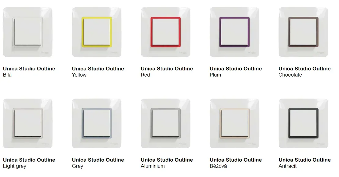 Čtyři barevné varianty přístrojů (Bílá, Béžová, Hliníková a trendy Antracitová) můžete kombinovat s jakýmkoliv krycím rámečkem Nové Unicy nebo i Unicy původní. Vzniká tak obrovský prostor pro personalizaci a přizpůsobení danému interiéru. K dispozici je celá řada barev krycích rámečků v řadách Unica Studio, Unica Studio Color, Unica Studio Outline, Unica Studio Metal, Unica Pure a Unica Pro. Krycí rámečky v nejvyšší řadě Unica Pure jsou pak vyrobeny z přírodních materiálů, jako jsou dřevo, břidlice, sklo, pryž či kov.