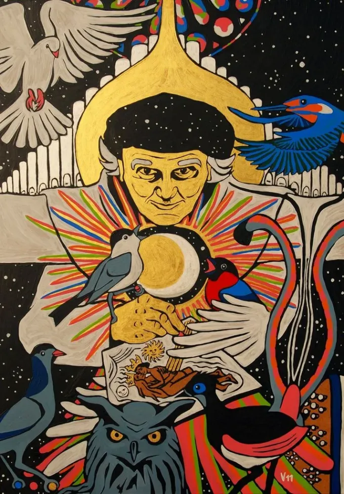Tento portrét zachycuje Messiaena jako Františka z Assisi, s jehož dílem a osobností se vnitřně ztotožňoval. Svatý František totiž mluvil s ptáky – stejně jako Mesiaen – a i jejich mystické pojetí křesťanství si je velmi blízké. František z Assisi je poslední Messiaenova opera – a tu jsem při malbě tohoto obrazu také poslouchal, nejvíce zachycuje esenci a poselství svého tvůrce.