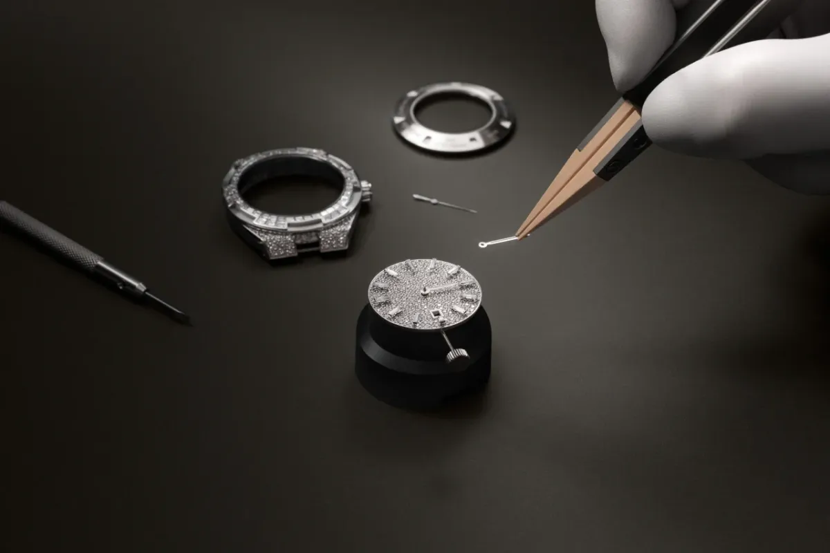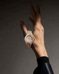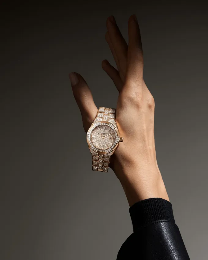 Skutečným těžištěm těchto hodinek je však jejich nevídané osázení drahokamy. Na pouzdru a náramku z 18karátového zlata se třpytí neuvěřitelných 1 430 diamantů, které proměňují časomíru v pulzující objekt světla. Luneta je zdobena bagetovými diamanty za použití techniky neviditelného zasazení, což je řemeslný proces vyžadující chirurgickou přesnost, kdy tolerance mezi kameny činí pouhých 0,02 milimetru. Ciferník a články náramku pak využívají techniku „snow-setting“, která věrně imituje jiskření čerstvě napadaného sněhu pod zimním sluncem, čímž vytváří texturu, která je stejně hmatatelná jako vizuálně úchvatná.