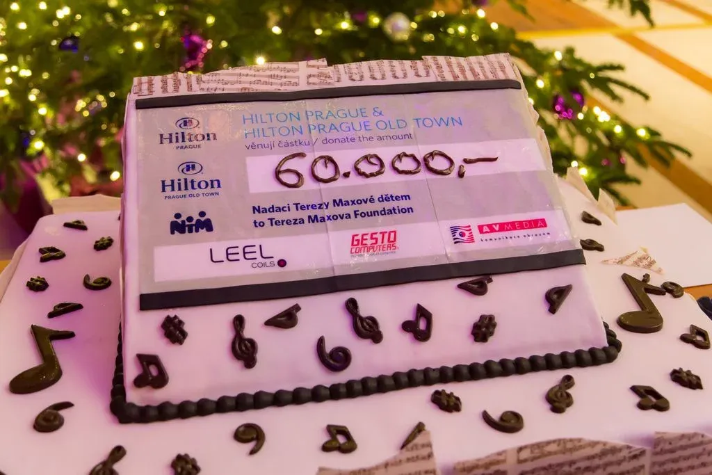 Šéfkuchař hotelu Hilton Prague Franco Luise překvapil hosty nejen výtečnou večeří po koncertě, ale i speciálním šekem na částku 60 000 Kč ve formě dortu, který generální ředitel hotelu Hilton Prague Michael Specking slavnostně předal Terezii Sverdlinové z Nadace Terezy Maxové Dětem.