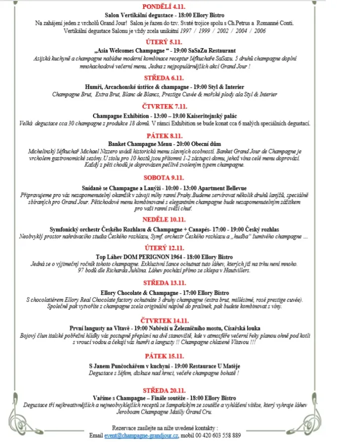 Během dvanácti dosavadních ročníků Grand Jour de Champagne byly vyzkoušeny společně s předními českými a francouzskými kuchaři nejrůznější kombinace, které se zdají být nekonečné. Proto byla vyhlášena soutěž o nejkreativnější recept vhodný pro spojení s víny z kraje Champagne.