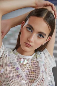 Kalhoty s knoflíky na boku a kontrastními pruhy na bundě připomínají tvar teplákových souprav z 90. let – lesklé, téměř technické látky dodávají kolekci živý nádech a rozjasňují ji. Bowlingové košile dostávají prostor díky „kapajícím“ duhovým makro flitrům. Nechybí ani denim, stylistický odkaz 90. let a skutečná ikona této dekády, které se s prošíváním a koženými vsadkami používají na cargo kalhoty, minisukně a šaty s dívčím nádechem, v jednobarevném nebo dvoubarevném provedení, s viditelnými zipy, které se stávají stylovými detaily.