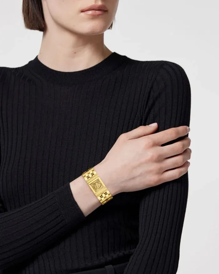 Pouzdro modelu má rozměry 25 x 18 mm a je zhotoveno v IP žlutém zlacení. Dominantním prvkem je plastická hlava Medusy umístěná na posuvníku, jež připomíná symbolické kořeny značky. Náramek v ladícím zlatém provedení s motýlkovou sponou obepíná zápěstí s lehkostí a přitom působí jako výrazný šperk. Tato kombinace spojuje eleganci šperkařského řemesla s přesností hodinářské techniky.