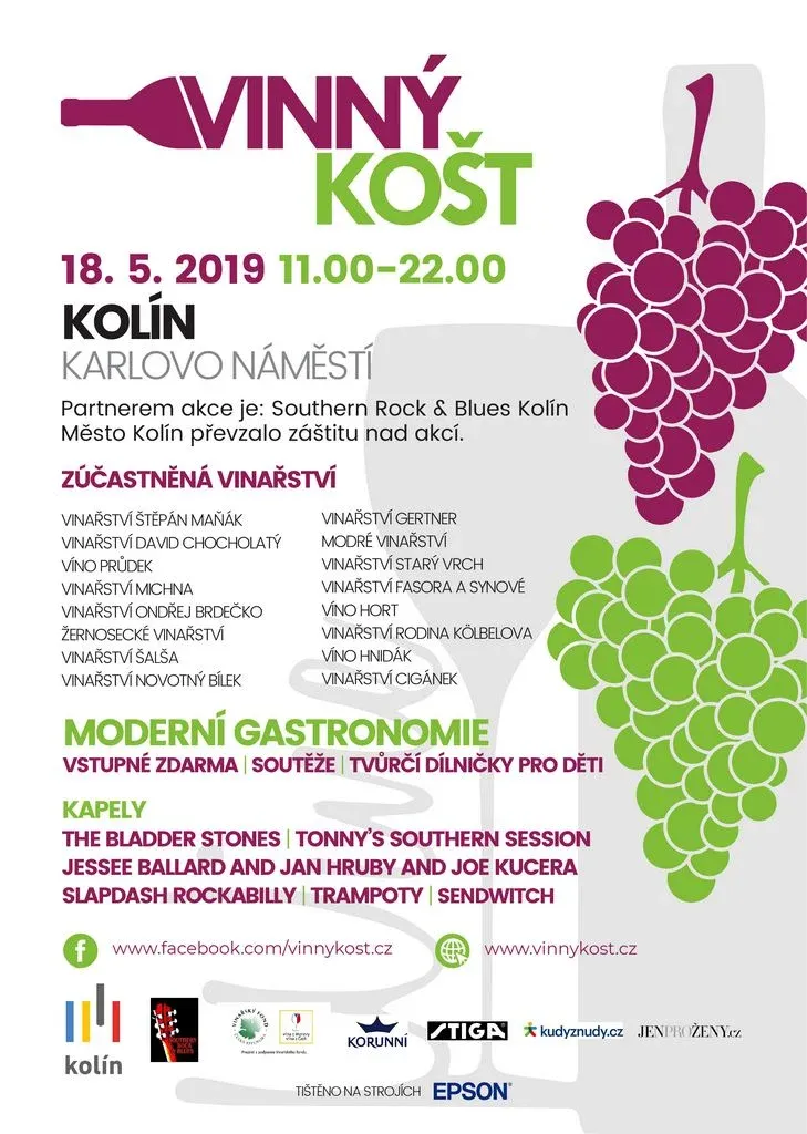 Vinný košt v Kolíně 12. Duben 2019 | Redakce LUXUS.cz | čtenost po 30 dnech je 10742 Datum 18. 05. 2019 11:00 Místo konání Karlovo Náměstí, Kolín Cena vstupenek Dress Code Přejít na Web