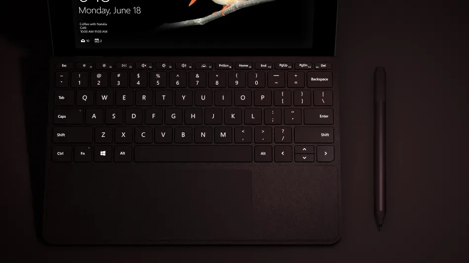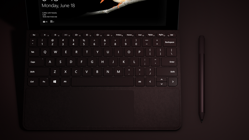 Stojánek stabilně udrží obrazovku v jakékoli poloze, dokonce i na klíně. Příjemně překvapeni budete z materiálu klávesnice – Alcantary, která připomíná semiš. Má podsvícené klávesy a při zavření navíc slouží jako ochrana. Surface Go je bezpečně přitažlivý. Magnety hladce přichytí stylus, klávesnici i napájecí kabel, který se však při trhnutí uvolní a ochrání tak vašeho miláčka před pádem na zem.